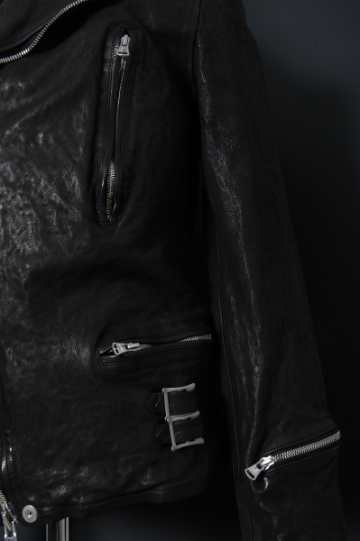 ベーシックなデザインのダブルライダースをブランドオリジナルパターンでソリッドに構築。胸部に垂直に、下方に水平2本ずつ計4本のファスナーポケットを配備、腰部の両サイドには前方に向かってダブルストラップのアジャスターを装着した英国らしさを感じさせるデザインを使用しています。高級レーヨンファブリックを裏地に採用することにより、非常に袖通しの良いライニング。ファスナーにはYKK社製高級タイプのEXCELLA(エクセラ)を採用、引手には実用性を考慮したブランドオリジナルデザイン。