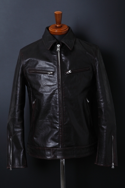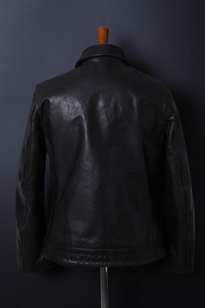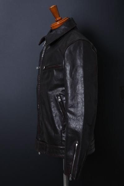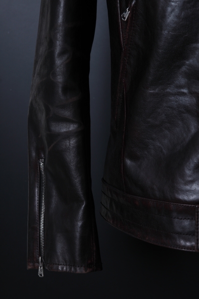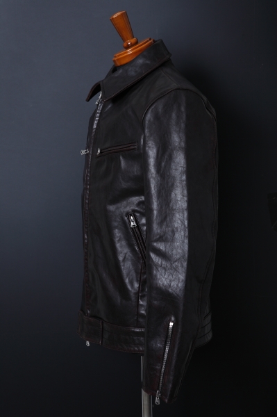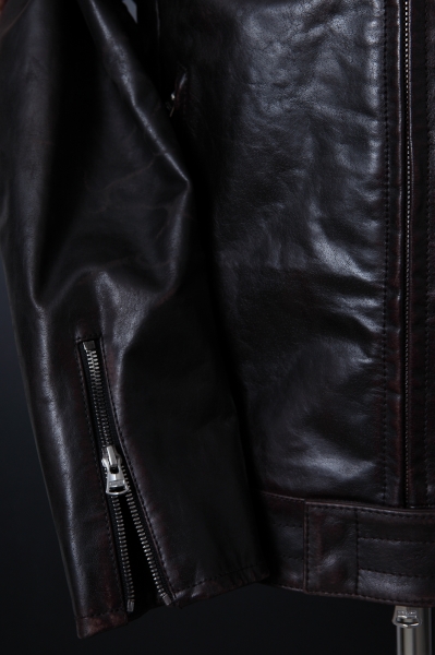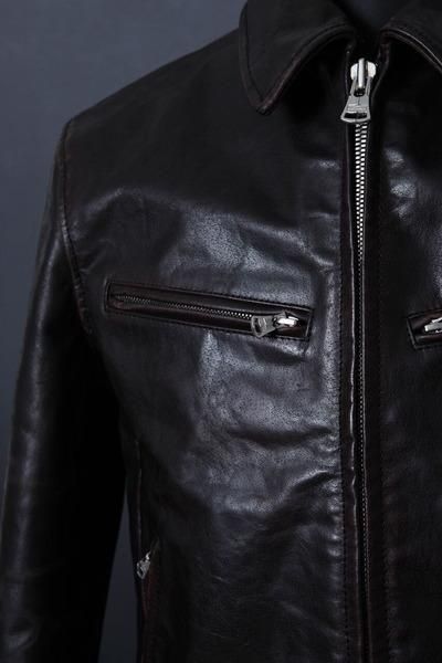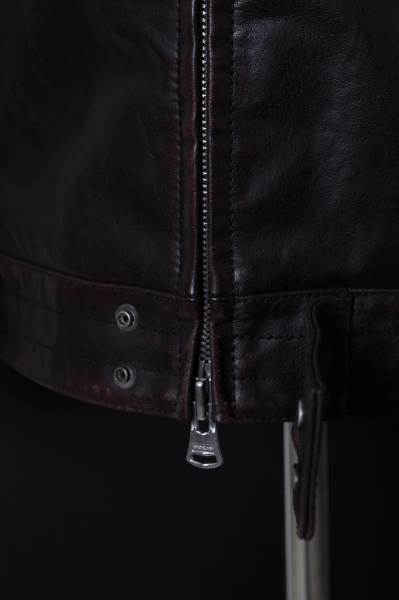 シンプルなデザイン性が特徴的なシングルライダースを基に、左右のチェストにファスナーポケットを配備しシンプルな中に主張を与えます。モーターサイクル乗車時にファスナーがタンクを傷つけないようにガードすることを意図したフロントのスナップボタンベルトを配備、背面は切り替えを入れることなく大胆に贅沢な一枚の革で取り、ライダース特有のディティールとシンプルさのバランスの良いデザインになっています。ファスナーには力の抜いた適度に軽い印象で、スタンダードを追求したYKK社製高級タイプのEXCELLA(エクセラ)を採用。エレメント全面に入念な磨きがかけられている為、滑らかなファスナーの開閉が可能です。片側内ポケットもご用意、ライニングは袖通しの滑らかなレーヨン裏地を採用しています。