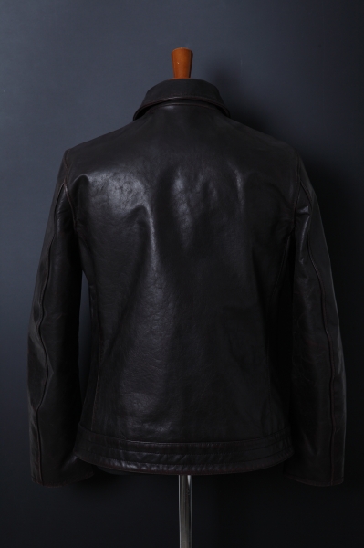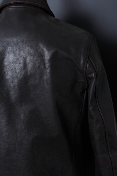 高い基準で厳選されたインド産バッファローレザー(水牛革)を採用。鞣しの工程でしっかりとオイルを含ませた後にさらに柔らかく仕上げる為に下地の状態で再度油入れを行なうことで、通常のバッファローレザーより柔軟性がありしっとりとした滑らかな質感、加えて肌理が細かく肌触りの良い印象です。たっぷりと油分を含んだ質感とは裏腹に、バッファローレザー特有のシボの伴う屈強性はしっかりと保たれており、牛革などでは出ない表情、耐水性が特徴になります。先染めでダークブラウンカラーに染色、製品を作り上げた後に洗い加工を行い、1.5サイズ程度の収縮仕上げを施しています。さらに一着一着製品の状態で熟練の職人の手作業により黒染料を吹き付けたオーバーダイ、全体的にダークブラウンカラーを覗かせる箇所を残しながら黒く仕上げる部分を作り上げ、アジのある風合いを表現しています。加工により形成した風合いを基に、永く着用を重ねることにより生じるエイジングが重なり、より一層独特の深みのある雰囲気を作り上げていきます。
